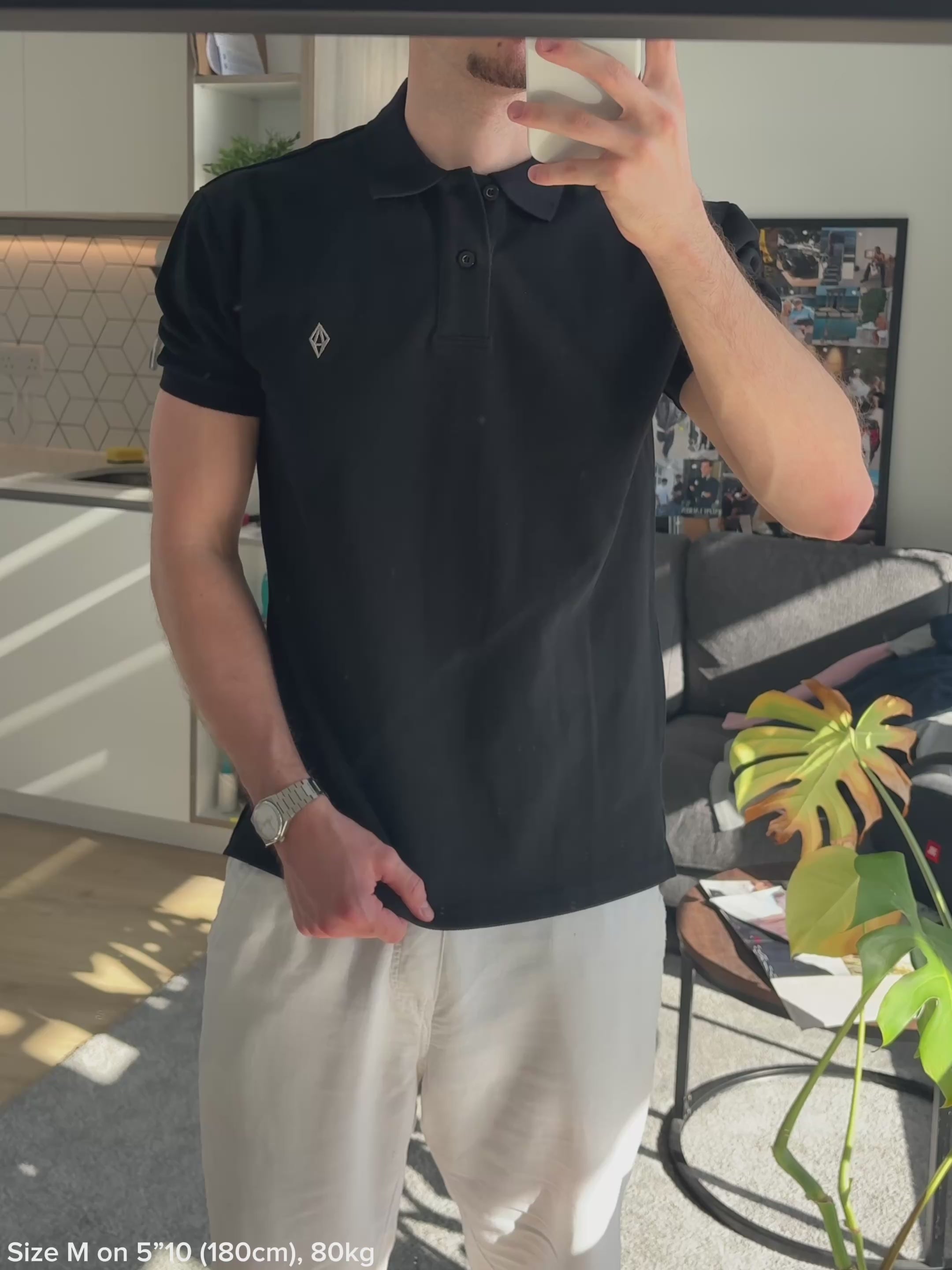 The Ody Polo, in black with our grey logo.